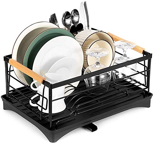 41. Modern Wood Handle Dish Rack and Drain Board, Attom Tech Home 16.5″ x 12″ x 5.5″ Kitchen Plate Cup Dish Drying Rack Tray Cutlery Dish Drainer -Dish Racks